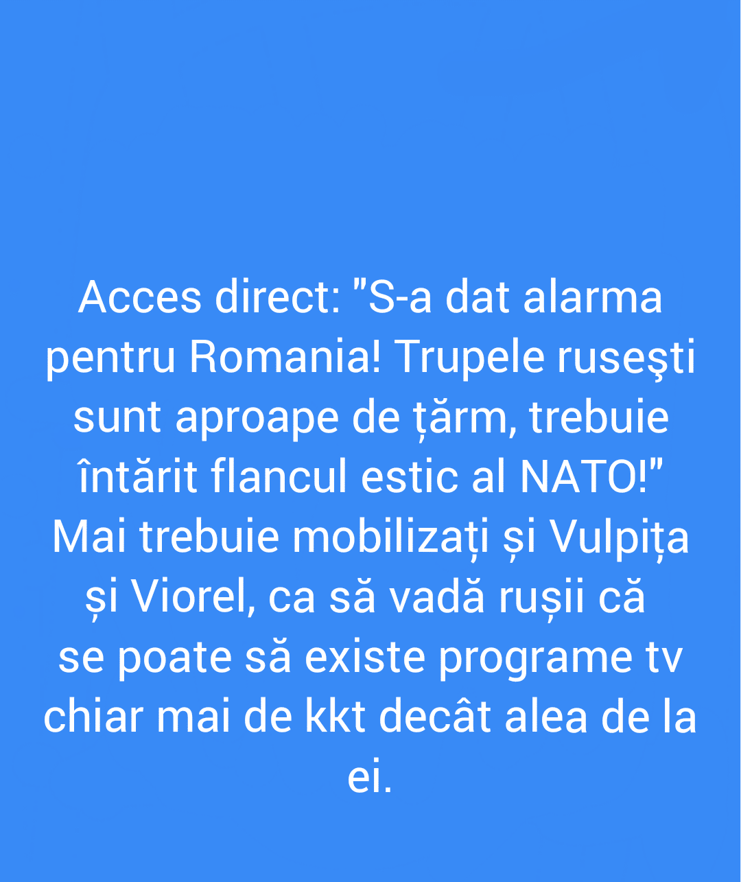 Acesta este un site cu conținut satiric căzut în patima ficțiunii. "Știrile" pe care le găsești aici nu sunt știri, nu sunt nici dezvăluiri și în niciun caz nu ar trebui să le găsești în afara site-ului, în realitate, decât dacă sunt de bine.