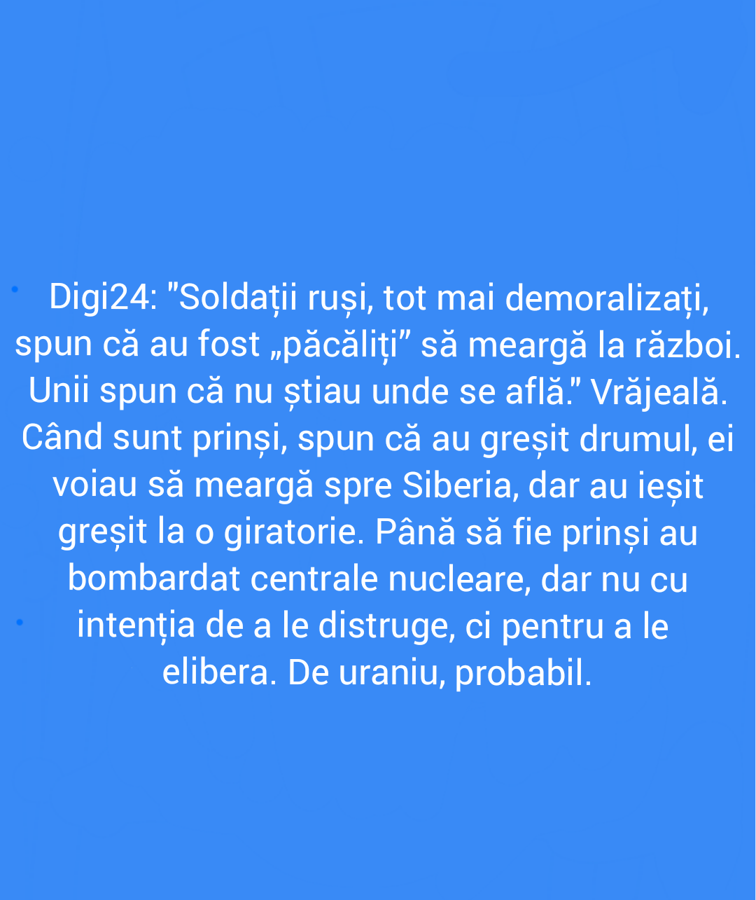 Acesta este un site cu conținut satiric căzut în patima ficțiunii. "Știrile" pe care le găsești aici nu sunt știri, nu sunt nici dezvăluiri și în niciun caz nu ar trebui să le găsești în afara site-ului, în realitate, decât dacă sunt de bine.
