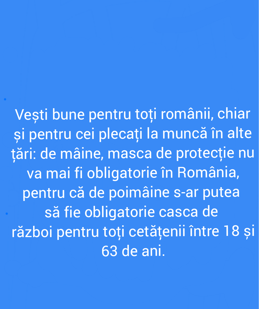 Acesta este un site cu conținut satiric căzut în patima ficțiunii. "Știrile" pe care le găsești aici nu sunt știri, nu sunt nici dezvăluiri și în niciun caz nu ar trebui să le găsești în afara site-ului, în realitate, decât dacă sunt de bine.