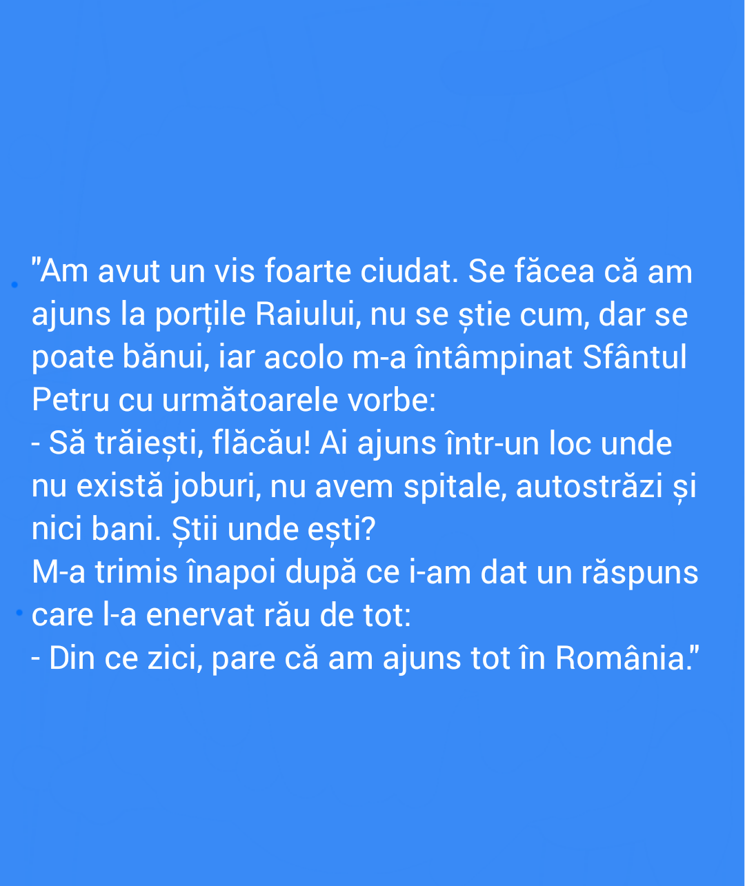 Acesta este un site cu conținut satiric căzut în patima ficțiunii. "Știrile" pe care le găsești aici nu sunt știri, nu sunt nici dezvăluiri și în niciun caz nu ar trebui să le găsești în afara site-ului, în realitate, decât dacă sunt de bine.