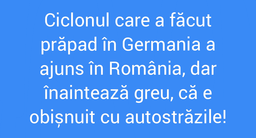 (Ciclonul care a devastat Germania și Belgia a ajuns și în România. După mai multe zile de caniculă și disconfort termic accentuat, nord-vestul țării a trecut la furtuni violente, cu căderi masive de apă, grindină și vânt puternic.” – Digi24)