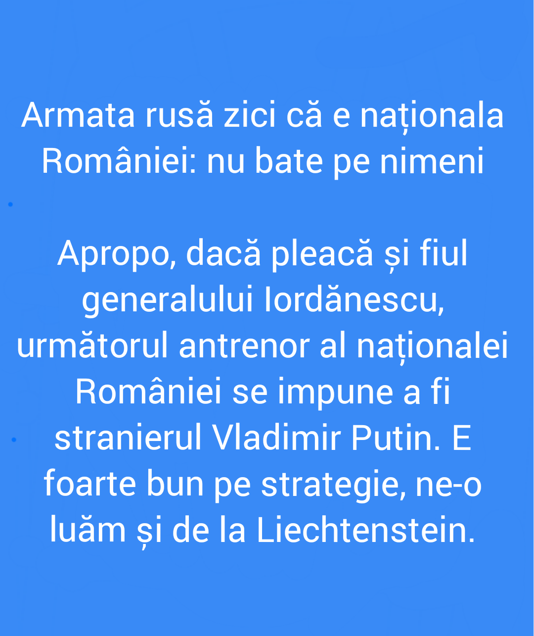 Armata rusă zici că e naționala României: nu bate pe nimeniby Comentacu30/03/2022no comment0SharesShare on FacebookShare on Twitter