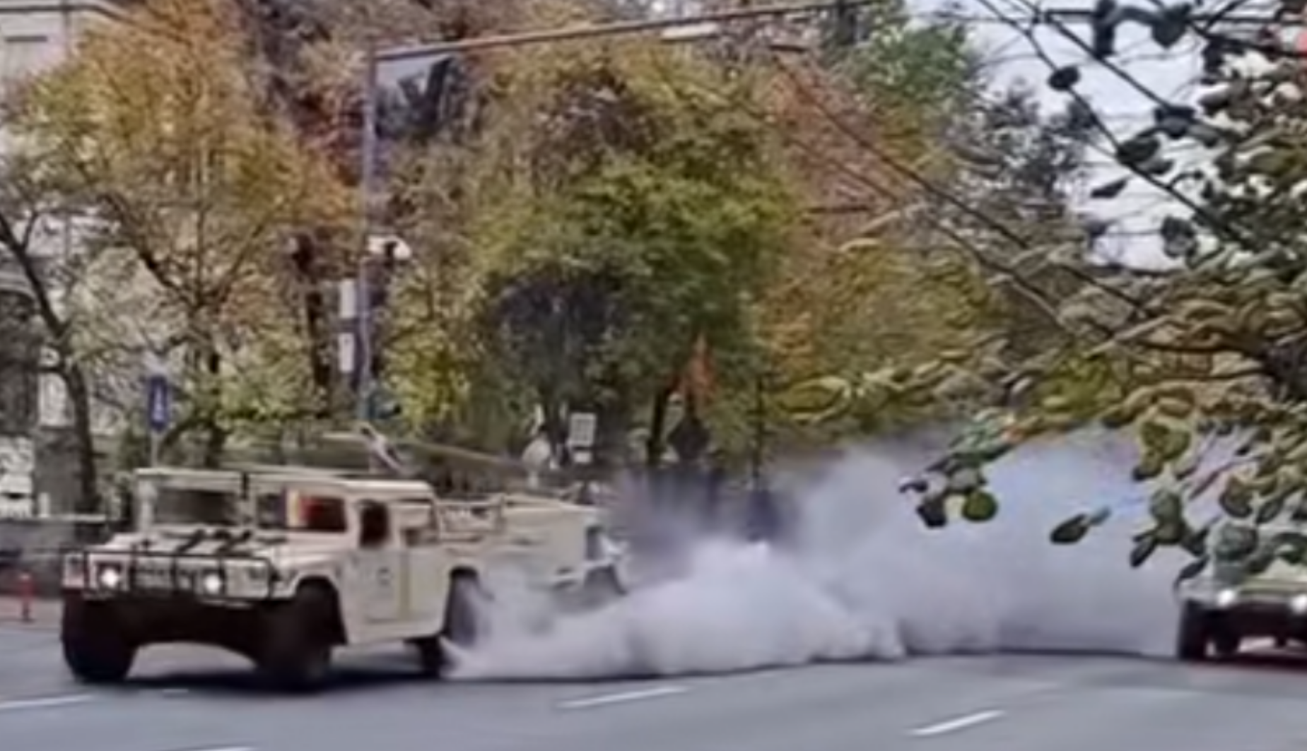 “Pare că a luat foc Humvee-ul Armatei Române în timp ce mergea spre defilare, dar nu despre asta e vorba. Acela este fum strategic. Ne camuflează pe noi, iar pe ruși îi îmbolnăvește de plămâni. Vă dați seama că noi, civilii, rămânem fără talon pentru una ca asta?”