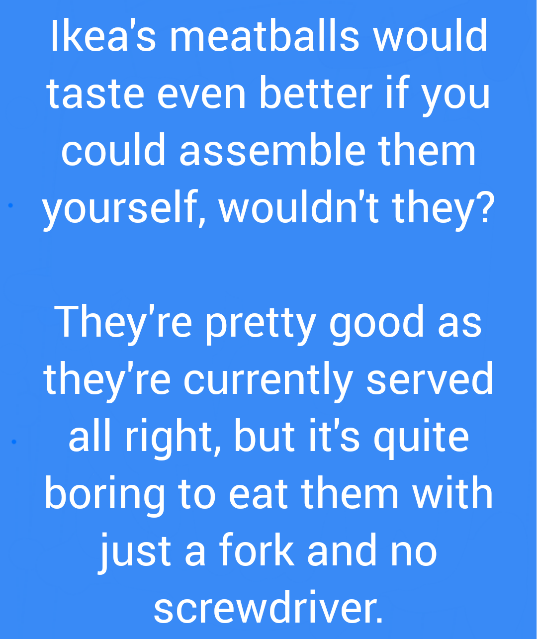 Ikea’s meatballs would taste even better if you could assemble them yourself, wouldn’t they?by Comentacu01/05/2022no comment0SharesShare on FacebookShare on Twitter