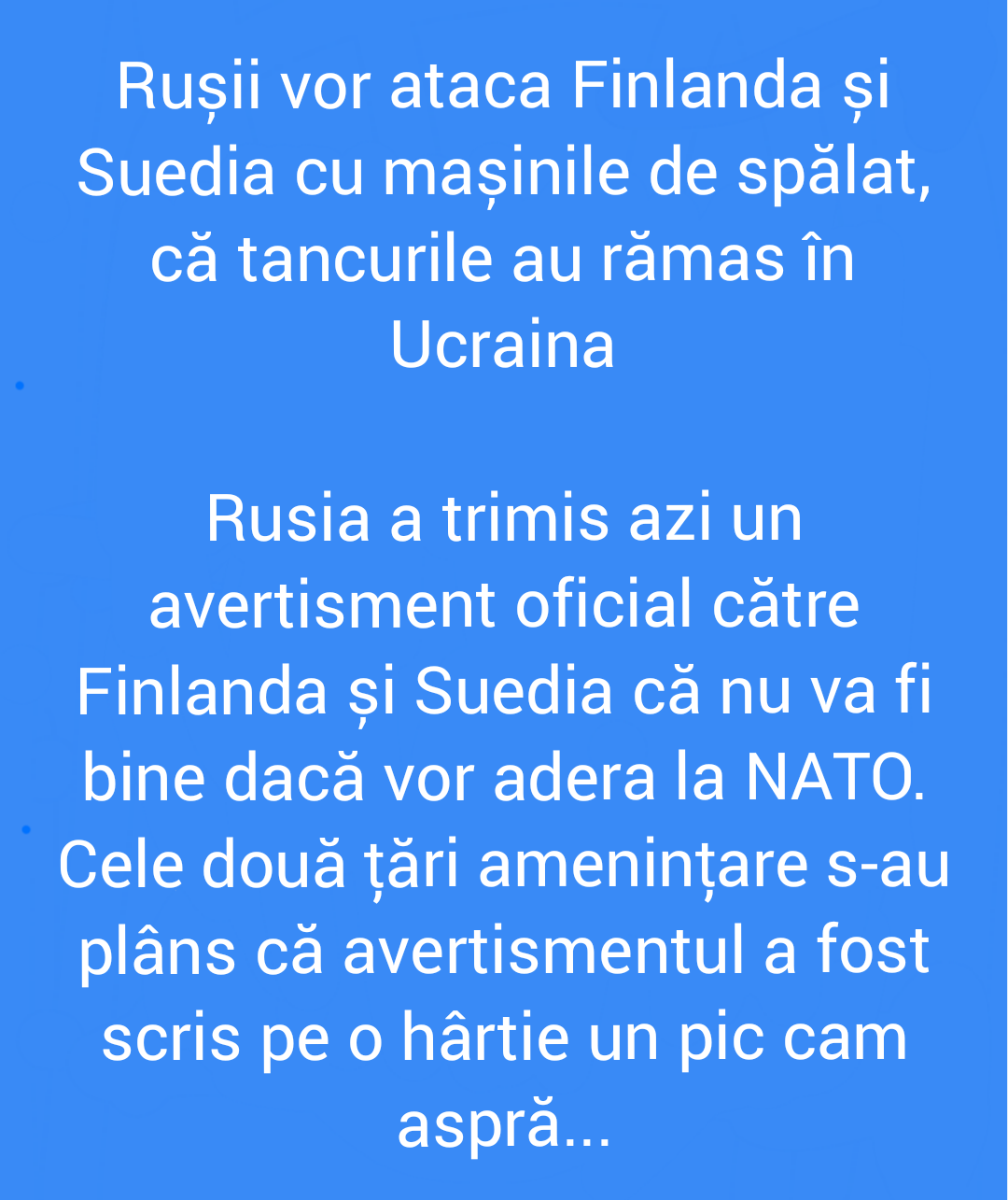 Rușii vor ataca Finlanda și Suedia cu mașinile de spălat, că tancurile au rămas în Ucrainaby Comentacu20/04/2022no comment1SharesShare on FacebookShare on Twitter