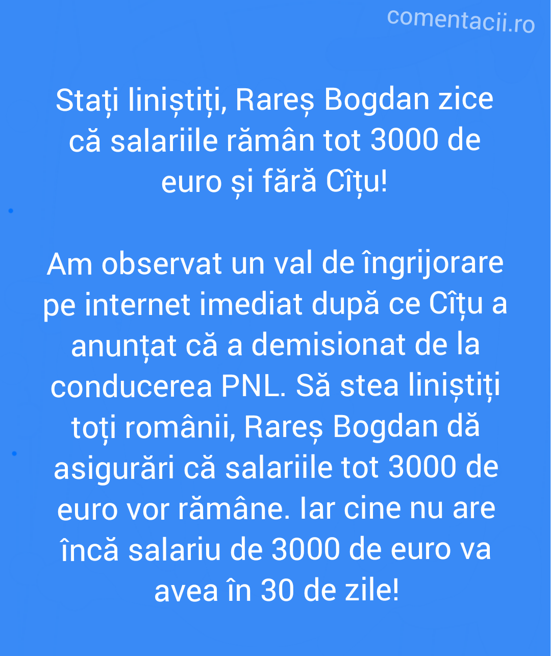 Stați liniștiți, Rareș Bogdan zice că salariile rămân tot 3000 de euro și fără Cîțu!by Comentacu02/04/2022no comment0SharesShare on FacebookShare on Twitter